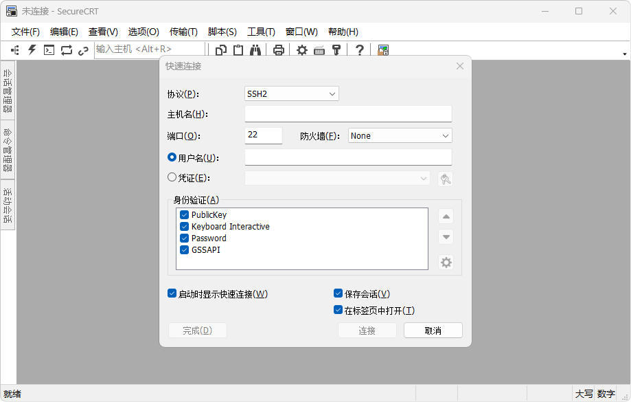 配置连接:选择协议(常用 SSH2),输入服务器 IP、端口和用户名即可建立连接